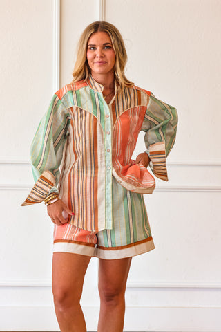 A nod to cowgirl tradition with a peek of lattice. Cactus green, melon sorbet, dusty apricot and saddle tan stripes that present as crisp linen but wear like air. Your go-to for those hot Summer rodeos or taking a whisper of Western on your beach trip.