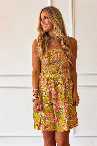 Shirred bodice and flowing skirt hugs in all the right places and floats everywhere else. The reto botanical print in lime zest, guava pink, and cocoa brown feels both grounded and wild. You're ready to be barefoot in the garden or headed to brunch with a woven tote and big sunglasses. Always down to bloom.